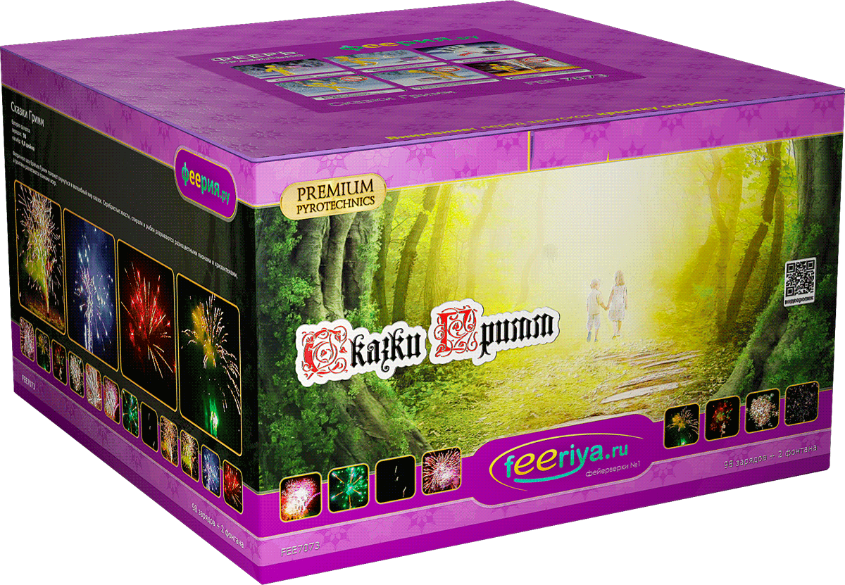 Фееричное шоу братьев Гримм поможет окунуться в волшебный мир сказок. Серебристые хвосты, спирали и рыбки разрываются разноцветными пионами и хризантемами, а фонтаны разлетаются сотнями искр.